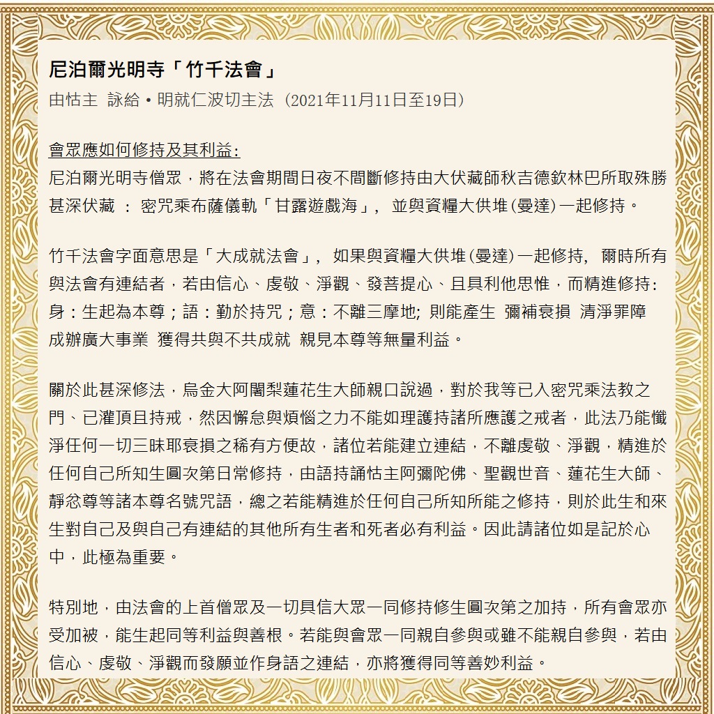 尼泊爾光明寺僧眾,將於法會期間日夜不間斷修持由大伏藏師秋吉德欽林巴所取殊勝甚深伏藏 : 密咒乘布薩儀軌「甘露遊戲海」, 並與資糧供堆(曼達)大成就法會一起修持。