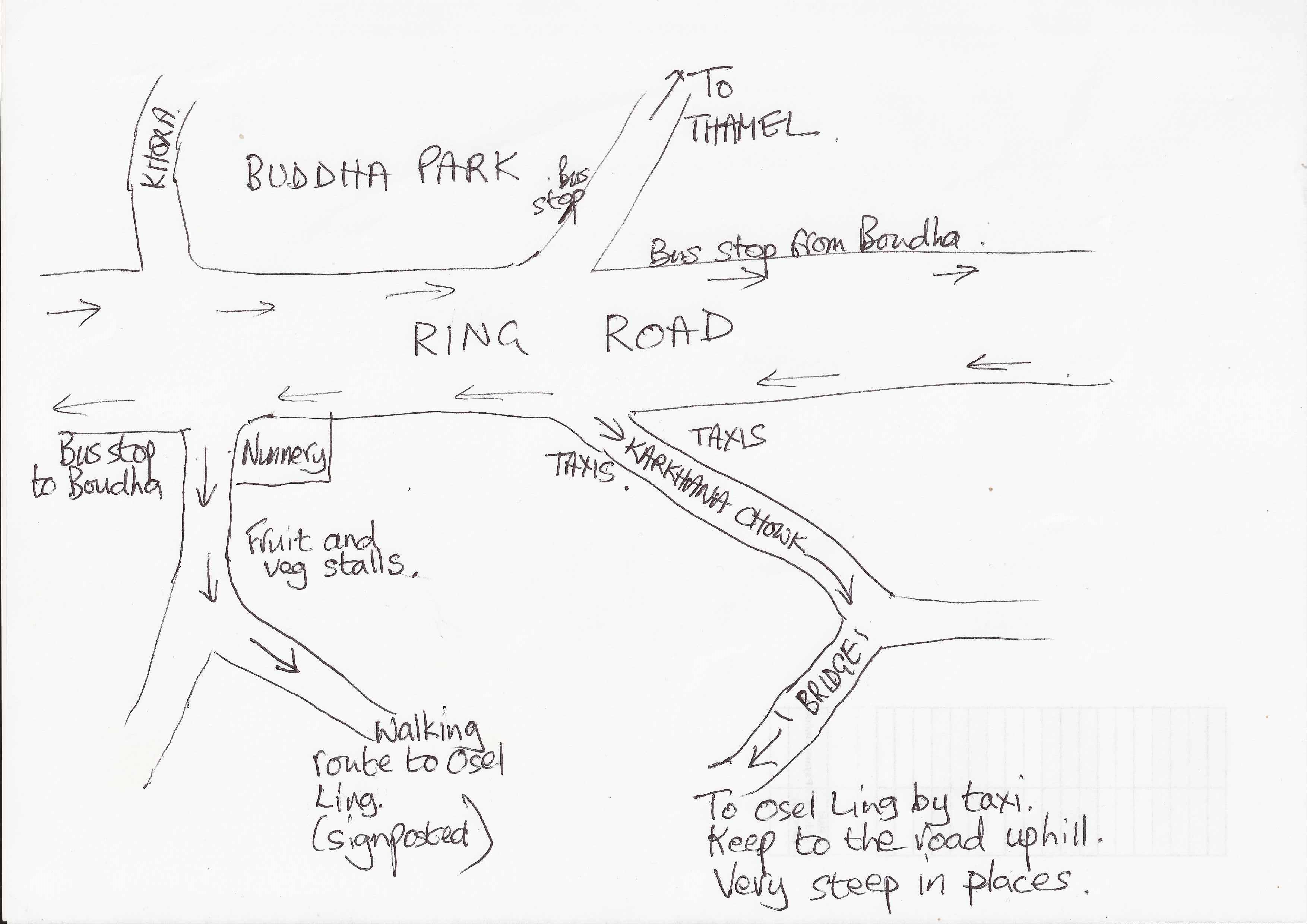 Ask for Swayambhu Buddha Park and direct the driver to Karkhana Chowk just off the ring road.  Osel Ling is well signposted but some drivers do not like to go up there, particularly in a full car because the road is very steep and uneven in places.   Telephone numbers of taxi drivers who know how to get to Osel Ling are listed along with a map of directions from the ring road.