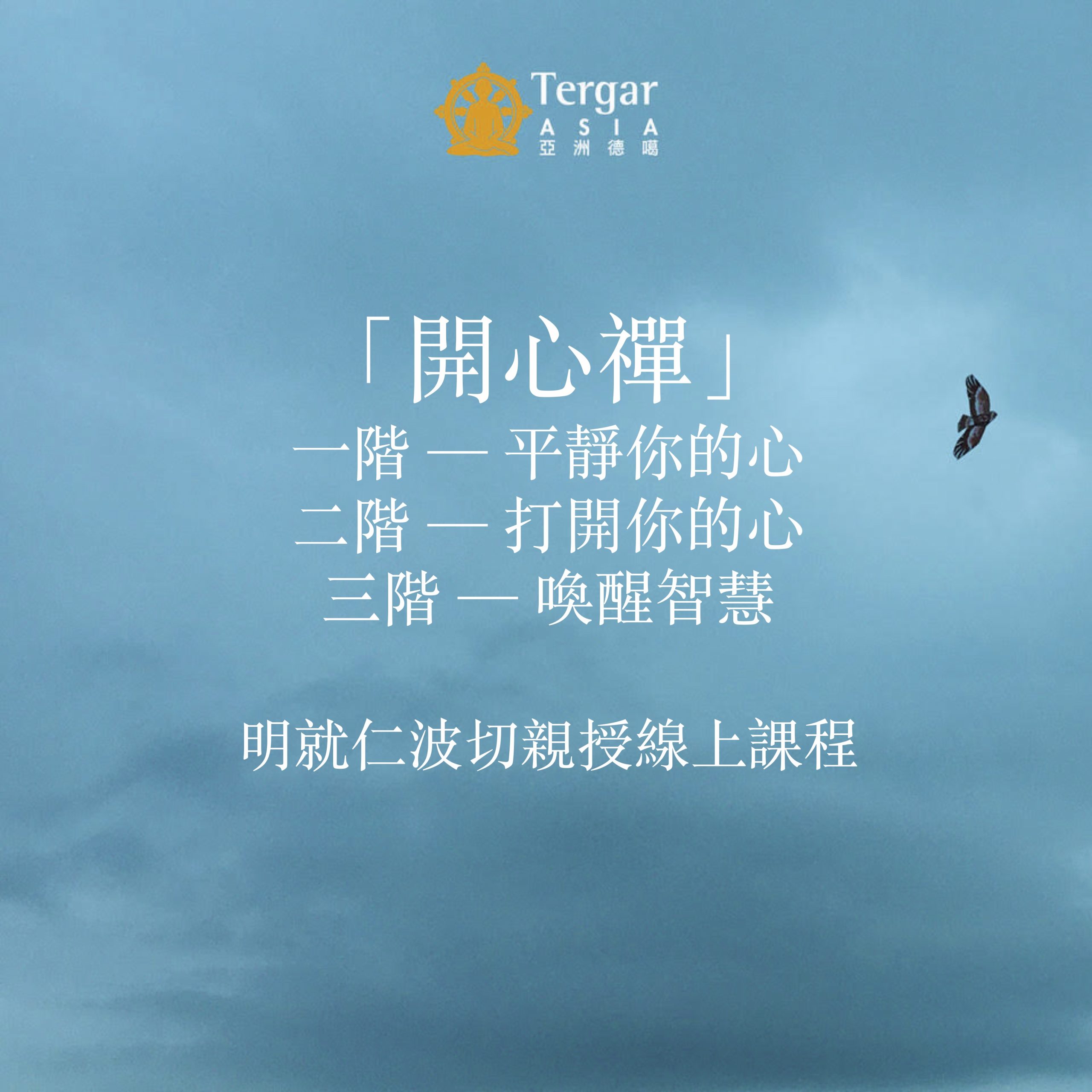 「開心禪」是人人皆可學習的禪修課程。在「開心禪」一階的課程中,明就仁波切會直接引導禪修,並教導如何將禪修運用於日常生活中,轉化我們的問題及負面情緒,從而找到內心的平靜。